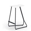 Barstool. Base steel, powder-coated with fine texture in black or cream, or chrome- plated. Or base copper-plated. Seat shell polyurethane, colour- varnished, or bend leather. Hook for bags in base colour. Plastic gliders in black.